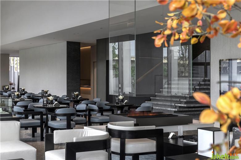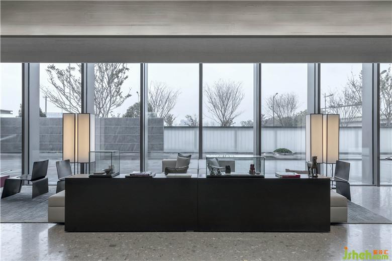 洽談區(qū)采用大面積落地玻璃,庭院之景,為空間增色,春夏秋冬,變?yōu)橐环噬嬜鳎肆⒂谑覂?,與自然產生連接,心境也因此越過藩籬,感受純粹的安寧。