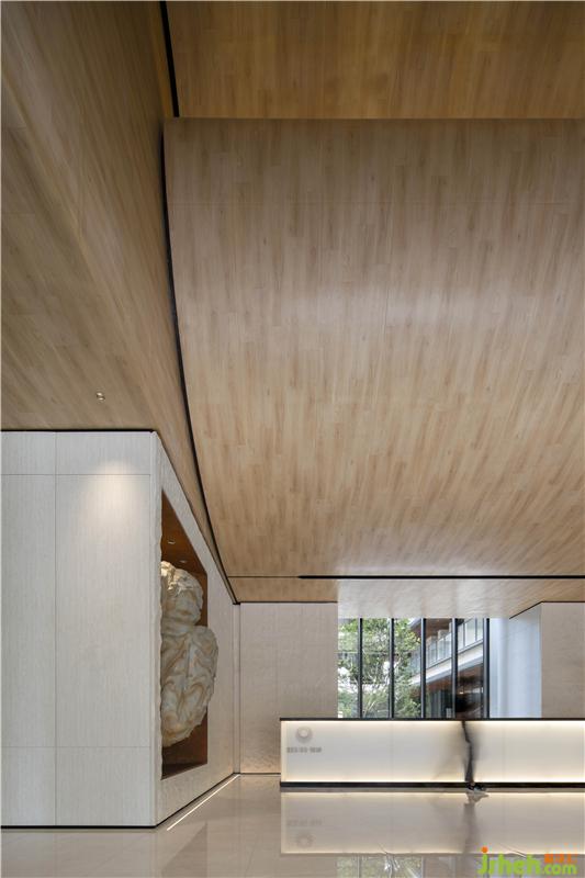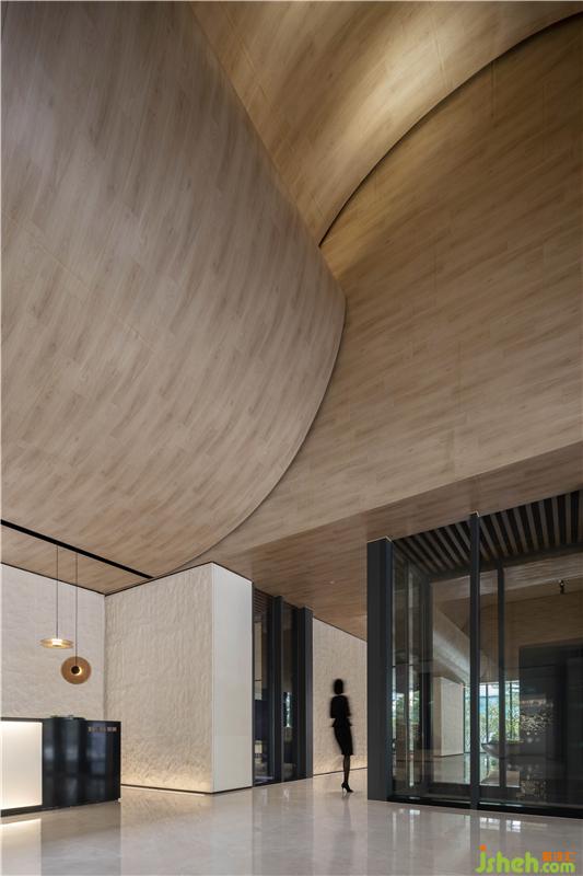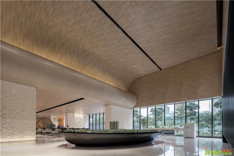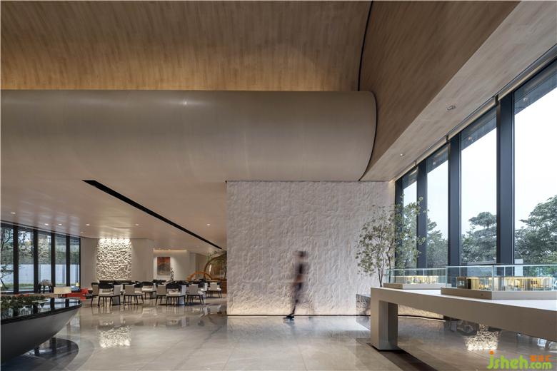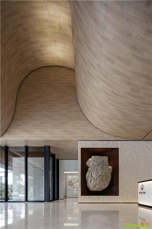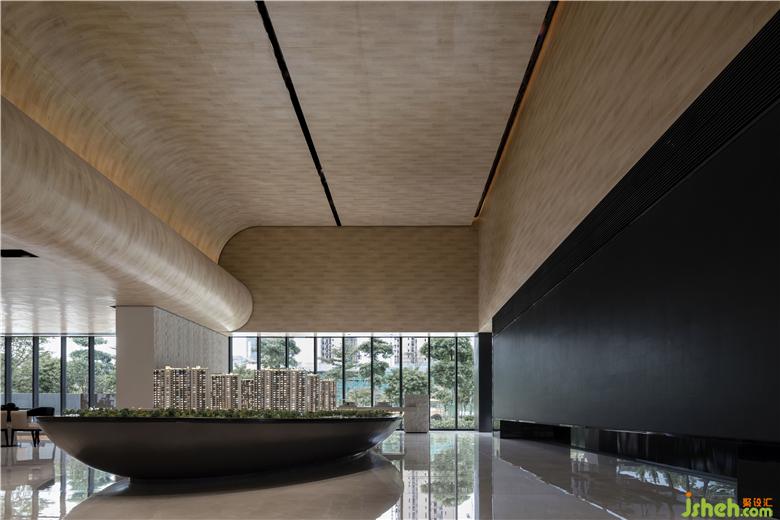 在室內(nèi)空間的構(gòu)建中,設(shè)計(jì)師從地域文化出發(fā),取嶺南特色建筑蝸耳墻之形感,采用現(xiàn)代設(shè)計(jì)手法,以當(dāng)代材質(zhì)為媒介,將其演繹于空間當(dāng)中。踏入接待前廳,便可從中一窺蝸耳屋古建筑之形。售樓處設(shè)計(jì)天花起伏有致,極具翻涌之勢(shì),呈現(xiàn)出如蝸耳般流暢的線條美感,從接待前廳延伸至沙盤(pán)區(qū),體現(xiàn)了空間對(duì)當(dāng)?shù)厝宋木竦奶綄?。接待前廳的石頭藝術(shù)裝置保持著粗糙的肌理,與簡(jiǎn)潔干凈的天花形成對(duì)比,讓空間更具趣味性,同時(shí)與洽談區(qū)相呼應(yīng)。