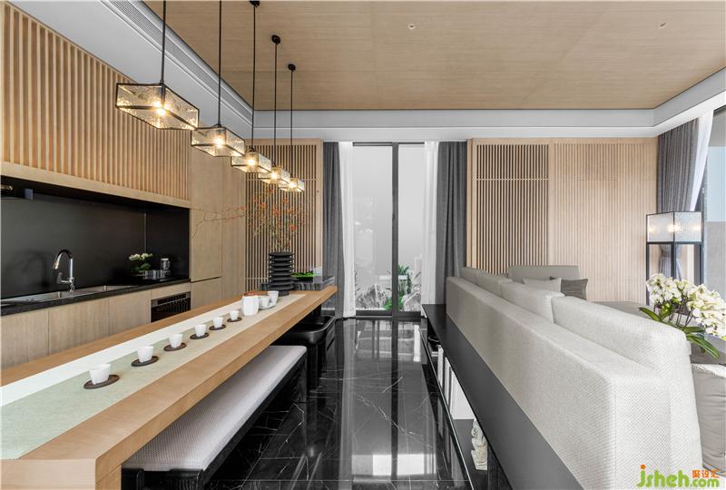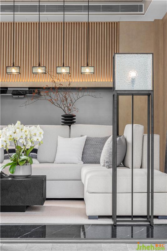 木質(zhì)的格柵給予客廳空間溫暖的包圍,質(zhì)樸的氣息由此流露而出。序列般的空間布局,半圍合沙發(fā)結(jié)合大理石地面,帶來舒適感與親近感,簡約的元素,賦予室內(nèi)以靜雅。