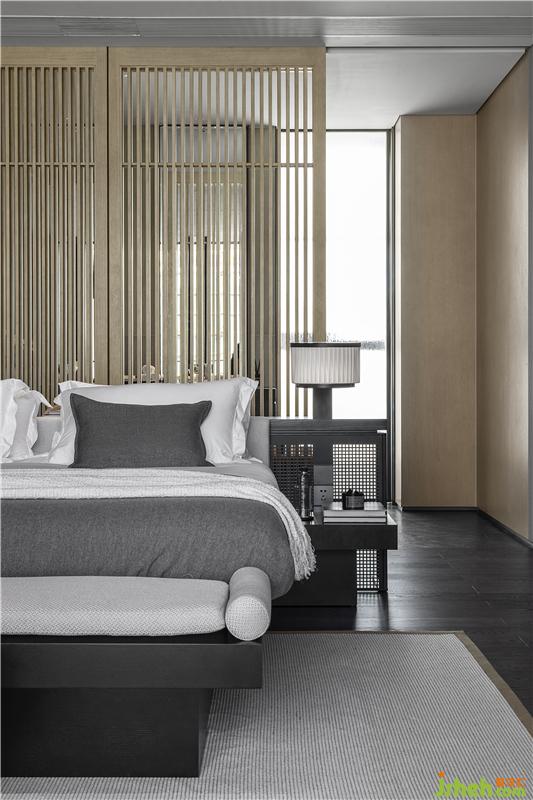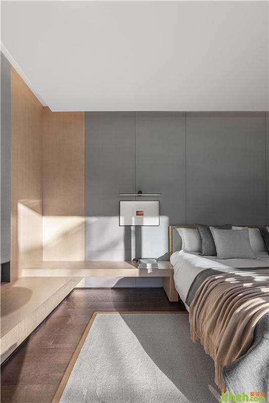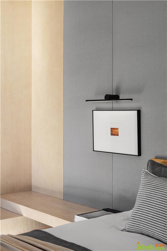 轉(zhuǎn)入二層主臥,墻壁的水墨掛畫“言有盡而意無窮”,水墨與虛白相互襯托,描繪出簡潔與空靈的意境,與空間的主題相呼應(yīng)。主臥延續(xù)了空間純粹的基調(diào),去除繁雜的設(shè)計(jì)語言,注重光與空間的互動,打造一個開闊的場域,讓心越過藩籬