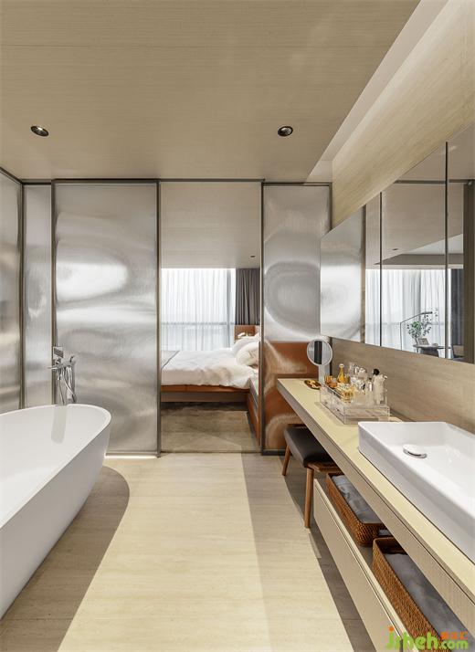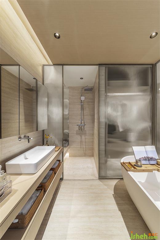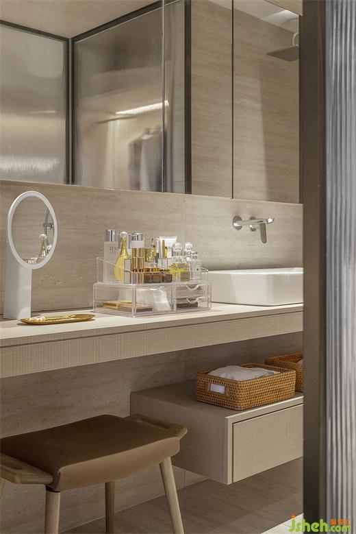 樣板房設(shè)計(jì)以護(hù)膚作為衛(wèi)浴的主題,溫柔的肌理與周圍空間相得益彰,多樣功能設(shè)置則營(yíng)造出一種舒緩的節(jié)奏,隱藏式的收納空間增加了生活感。