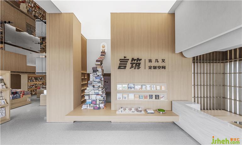 通過言幾又品牌的植入,加入悠閑的情景體驗,滿足生活的多種可能性。銷售中心設(shè)計趣味書本裝置,線條利落的原木書架與空間內(nèi)純粹的大理石肌理相結(jié)合,營造出極具儀式感的前廳空間。