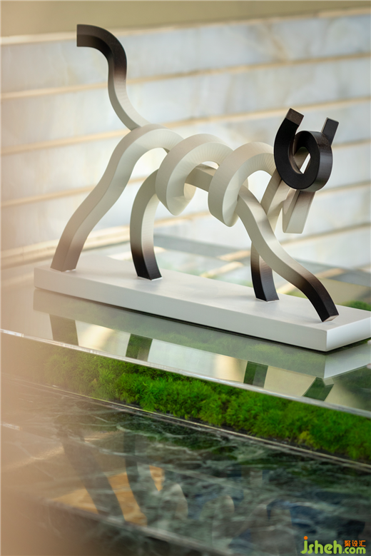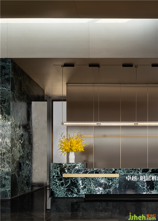 接待前臺的翡翠綠大理石潤滑明亮,優(yōu)雅的紋理宛如一幅水墨畫作。輕盈的金屬與之形成序列,用點、線構(gòu)筑面的意象,青島卓越蔚藍群島瀧樾設(shè)計傳達出精致干練的美學(xué)氛圍。