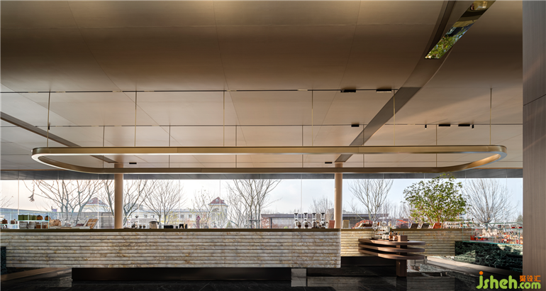 青島卓越蔚藍群島瀧樾設(shè)計具有獨特幾何構(gòu)成的燈具裝置,通過黃金比例的分格、穿插、金屬的晶瑩質(zhì)感,營造出光的層次。