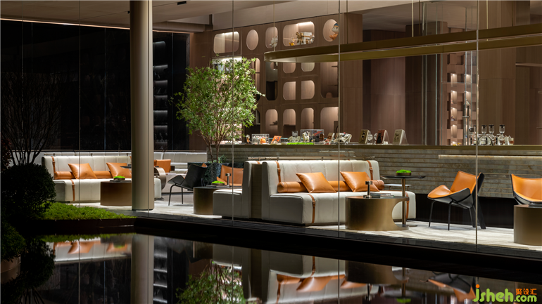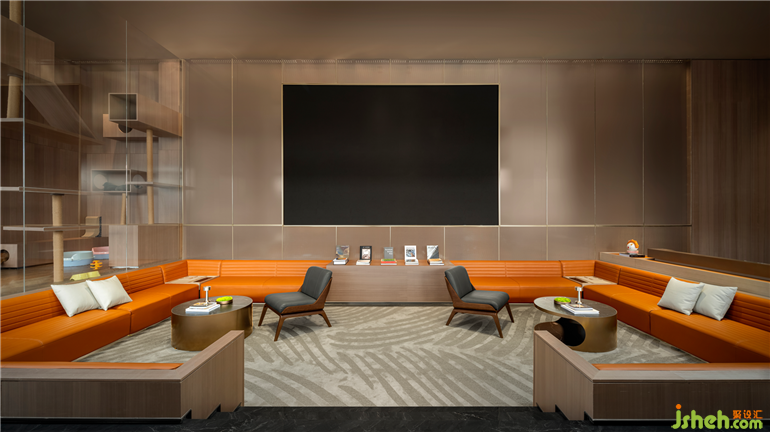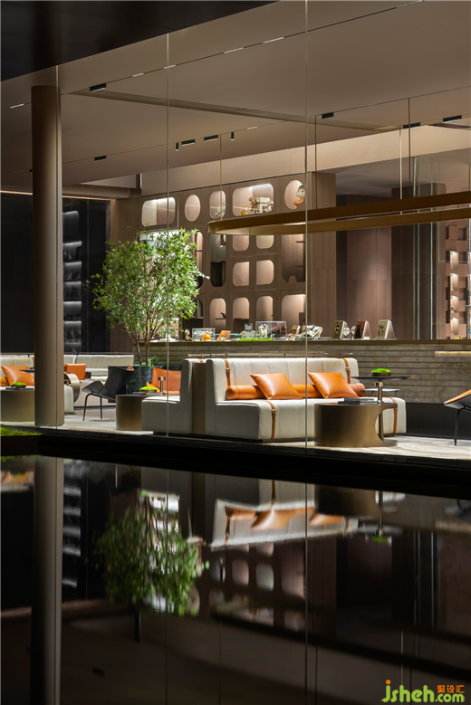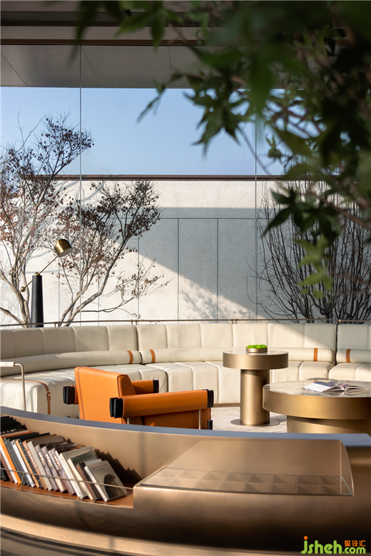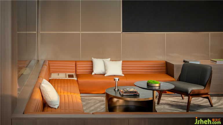 下沉式洽談區(qū)營(yíng)造圍合感,讓交談氛圍更輕松。同時(shí)高低落差的構(gòu)造結(jié)合落地玻璃窗,讓該區(qū)域更具空間層次,形成視覺(jué)上的趣味性。