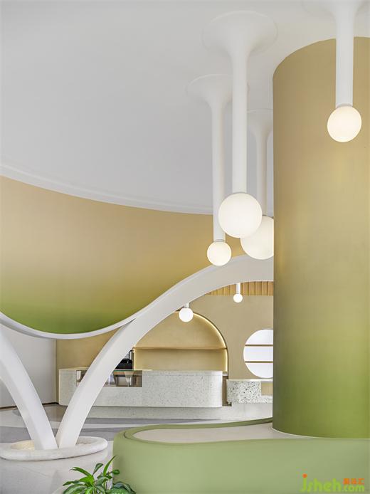接待臺與咖啡吧功能結(jié)合。廈門幼兒園設(shè)計以圓拱造型圍合空間,為空間的動線布局帶來更大的自由度,保持了大廳空間整體性和通透性,這也為孩子們創(chuàng)造出更多玩耍的可能性。