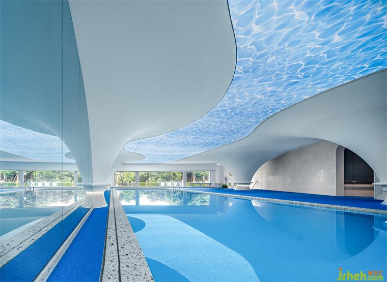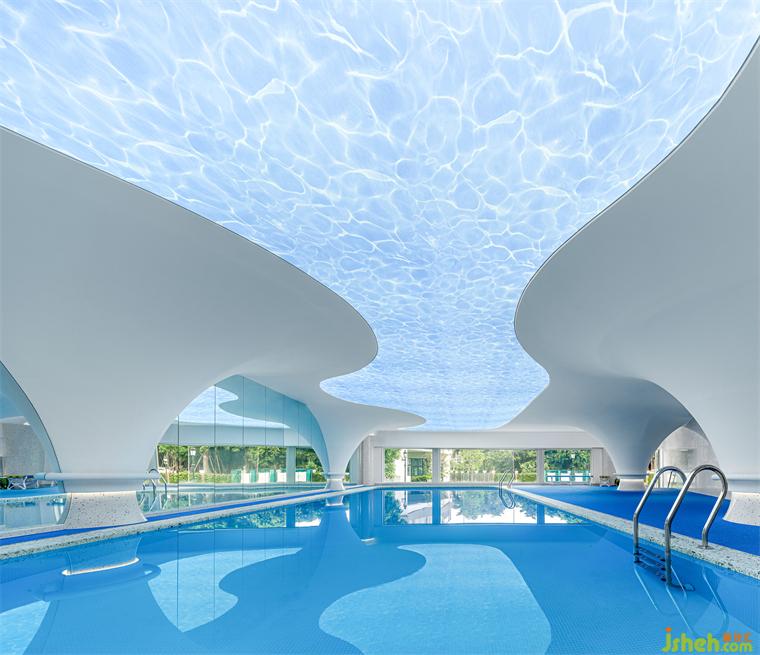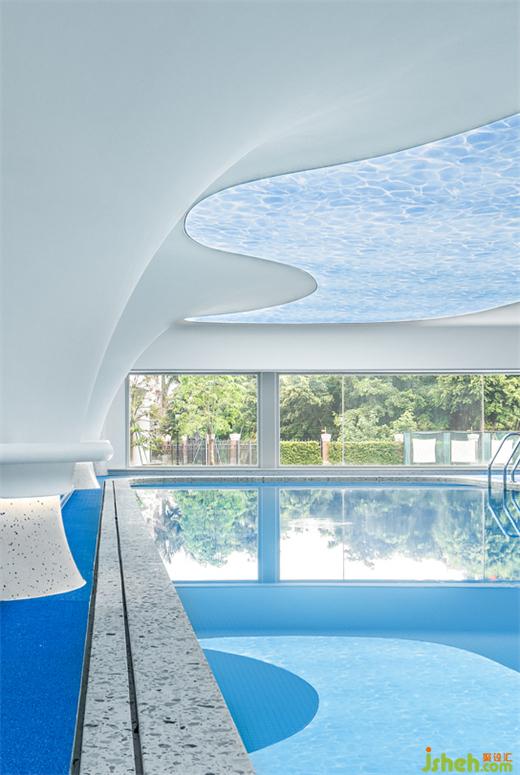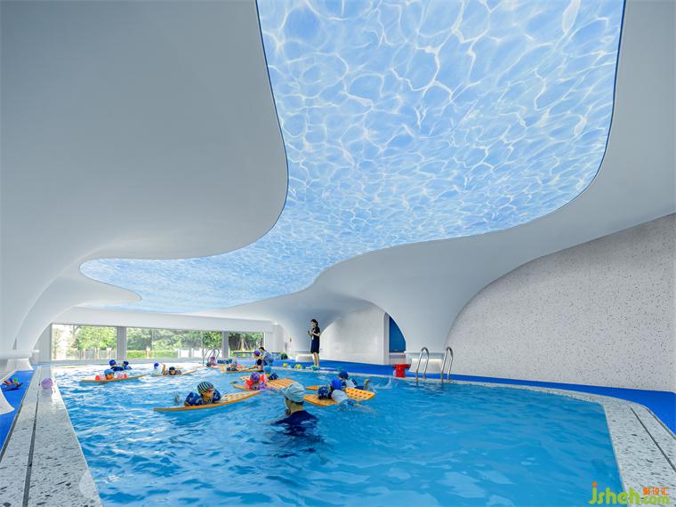 廈門幼兒園設(shè)計用一種極簡而整體的形式表達出空間連貫與統(tǒng)一性,這種純粹的表達更象是水要傳遞給我們的啟迪,天花倒映的水體,形成一種空間懸浮效果,如同沉浸在水體之中。