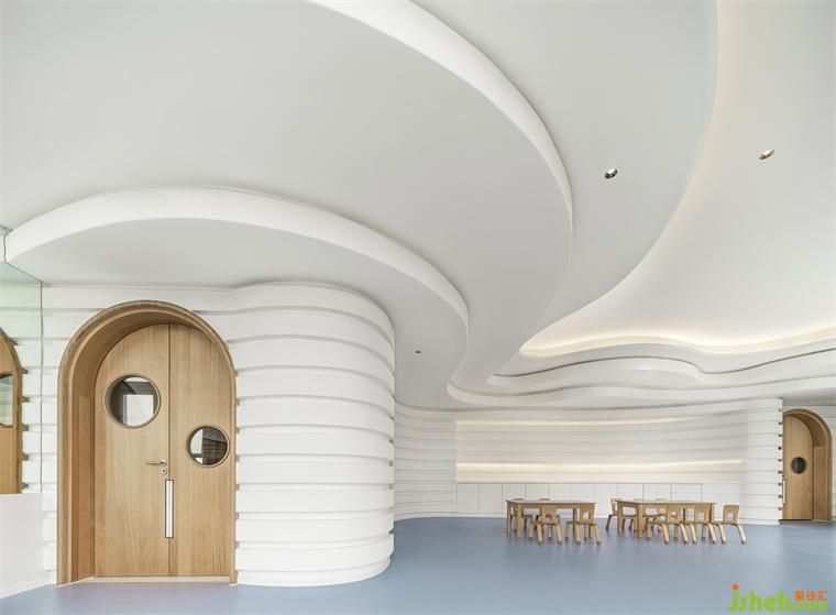 天花形成風(fēng)推動(dòng)云層的感覺,仿佛隨著門的推開能看到天花涌動(dòng)云層翻滾。廈門幼兒園設(shè)計(jì)以造型手法,賦予空間一種生命力和動(dòng)勢感覺。引入云朵的概念,為孩子們營造出一種安靜舒適的環(huán)境氛圍。讓孩子們感受到輕松與寧靜,更有利于他們的學(xué)習(xí)與成長。