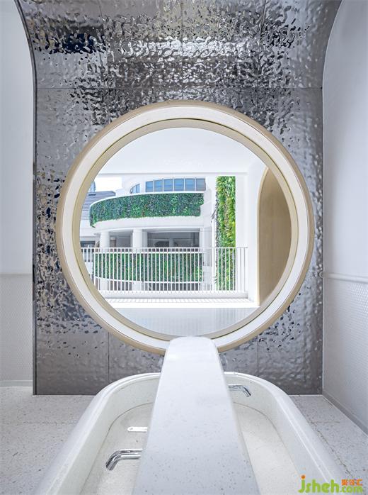 廈門幼兒園設(shè)計(jì)以借景手法,在波光粼粼的墻面打開一扇想象的窗。洗手成為了一個(gè)非常有樂趣的事,這個(gè)區(qū)域成為公共空間的一個(gè)焦點(diǎn)
