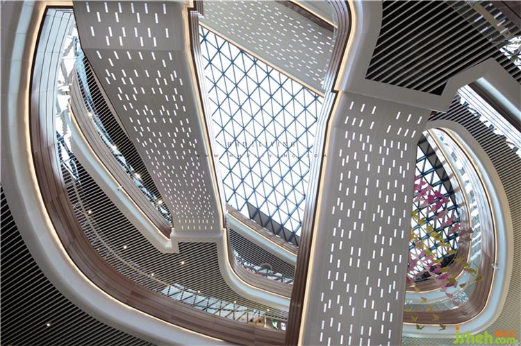 廣州百信廣場位于中國廣州白云區(qū)的核心商圈,建筑面積有16萬平方米。HHD假日東方設(shè)計集團與美國LLA建筑設(shè)計公司合作,HHD負責技術(shù)深化的設(shè)計。HHD也延續(xù)建筑設(shè)計的理念,將自然的紋理融入到設(shè)計當中,將山峰、巖層、流水等抽象元素作為室內(nèi)方案的深化,結(jié)合鋁板、玻璃等裝飾材料加以體現(xiàn),整體風格簡約明快, 空間線條流暢輕快,打造一個現(xiàn)代自然的商業(yè)廣場。