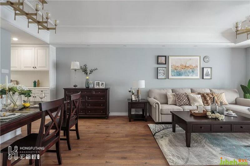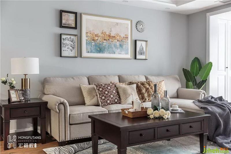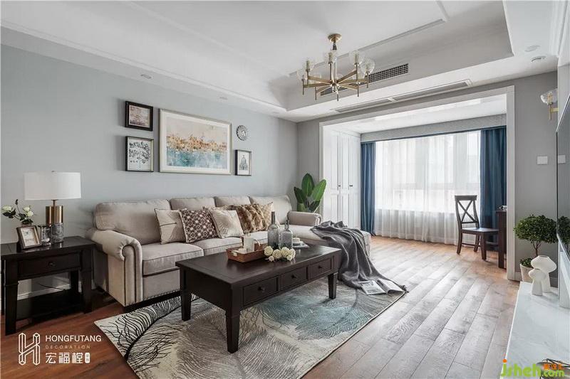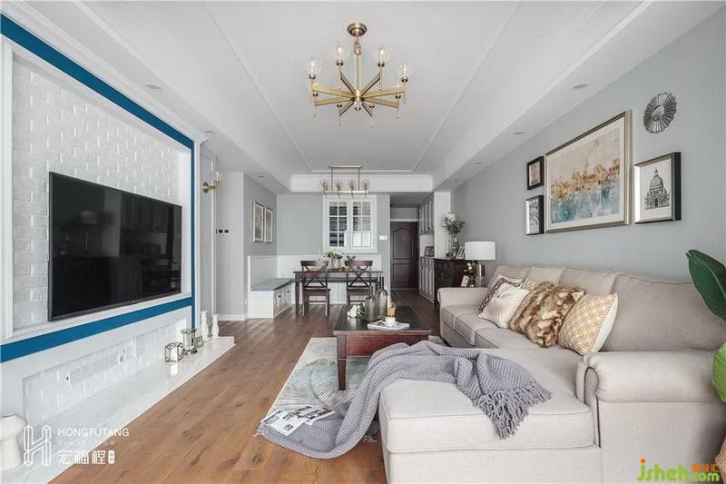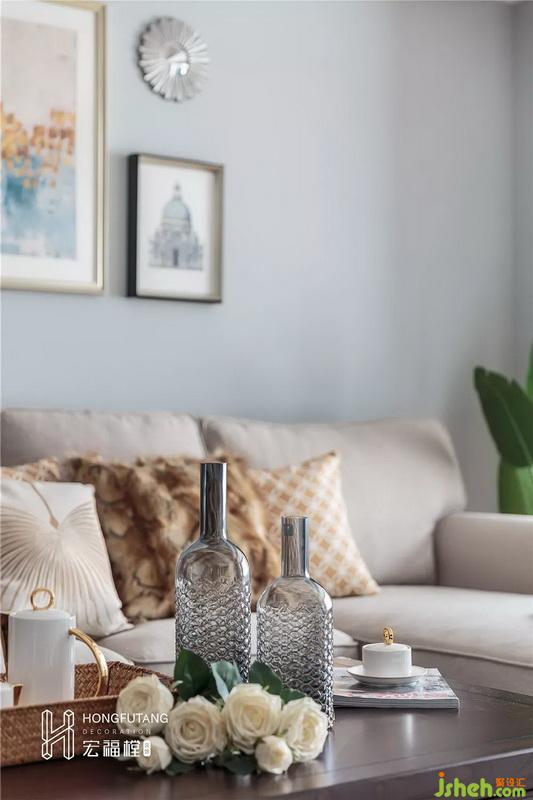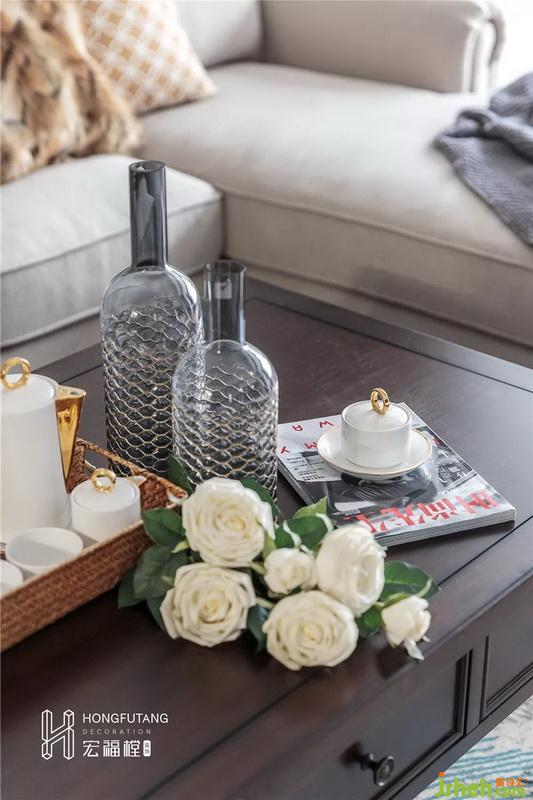 為保證足夠的開闊感,客廳以灰白棕為主色調(diào),自然干凈的灰色墻體與沉穩(wěn)安靜的木質(zhì)地板相呼應(yīng),再搭配深棕色的茶幾邊幾,色彩搭配輕重和諧,簡(jiǎn)約的同時(shí)又不失格調(diào);選擇彩色油畫作為沙發(fā)背景,緩解了視覺上的清冷;淺棕色的沙發(fā)與羽毛地毯帶來(lái)一種溫暖與浪漫的感覺;影視墻以白色磚面為主,搭配藍(lán)色線條,清新明朗,選用壁燈設(shè)計(jì),增添氛圍燈光的同時(shí),也避免了墻面的空白,精致的小擺件顯示著業(yè)主的品味和對(duì)質(zhì)樸生活的理解。