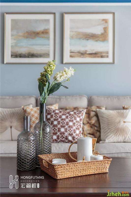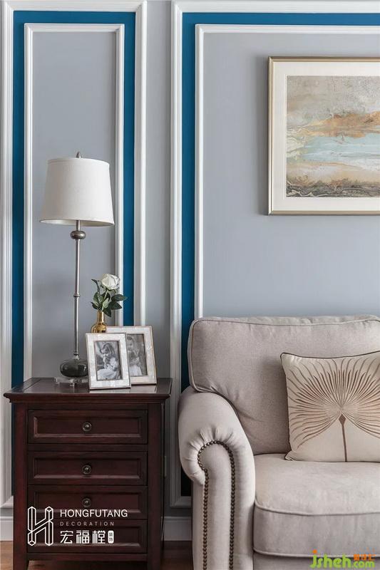 客廳正對進門,選用L型沙發(fā)靠陽臺可以減少對視線的遮擋,由于整個客廳空間內(nèi)沒有深色出現(xiàn),所以在茶幾的選用上,棕色系木質(zhì)茶幾能夠調(diào)和空間色彩,深淺搭配,提高空間的質(zhì)感;沙發(fā)墻選用線條設(shè)計,為墻面增加凹凸感,層次感更強,小面積水藍(lán)色的出現(xiàn),綜合天青色帶來的沉悶感,空間更有活力。
