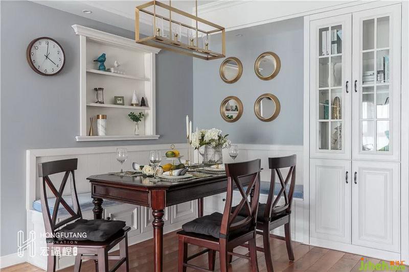 由于餐椅選用卡座形式,靠餐廳墻面剩余空間設(shè)立客廳同款收納柜,將餐廳空間最大化的運用;餐廳墻面設(shè)立嵌入式展示空間,可以擺放日常小擺件,在細(xì)節(jié)處體現(xiàn)美式的精致。