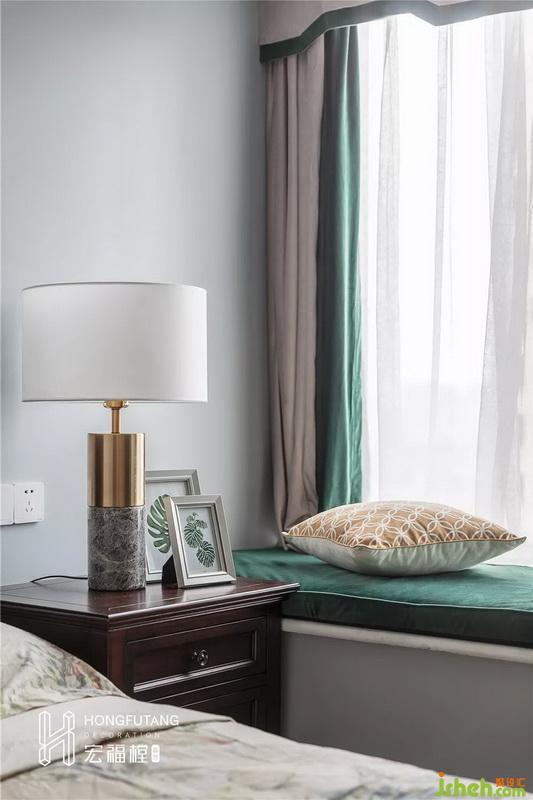 次臥室內(nèi)設(shè)計(jì)師延續(xù)主臥風(fēng)格,在空間布局上稍顯局促,所以只設(shè)立一個床頭柜;軟裝采用墨綠色,搭配棕色床頭柜,墨綠色有自然的氣息,棕色又能給人沉靜的氛圍,疲憊一天想要安眠與好夢。