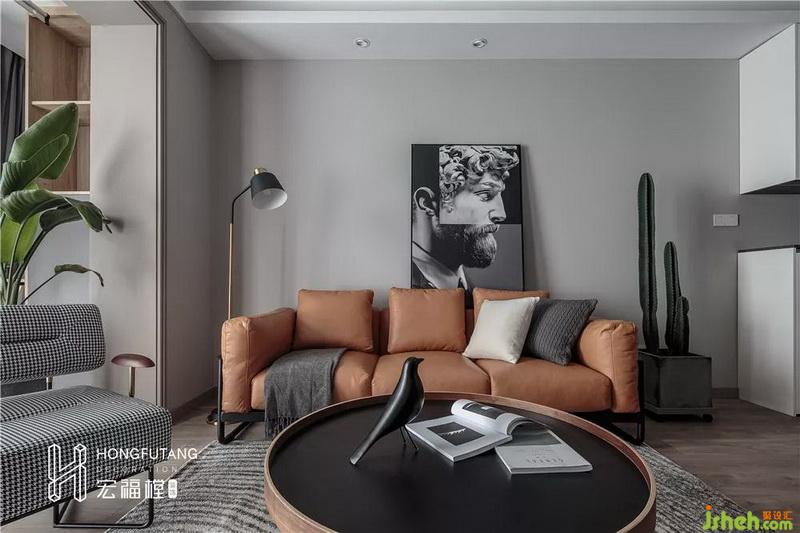客廳空間以灰色為主,現(xiàn)代感強,空間氣質(zhì)冷冽,搭配皮質(zhì)三人沙發(fā)提高空間質(zhì)感;客廳空間顏色單薄,在不打破原有和諧色彩的情況下,選用千鳥格單人椅豐富視覺;客廳空間有限,選擇圓形茶幾減少對客廳空間占用的同時,方圓均衡,體現(xiàn)一種簡約的和諧感;電視柜選用懸空設(shè)計,減少滿柜的呆板,木色與灰色搭配,層次感更強,將電視墻插頭都放在開放式柜中,日后放置電視盒更為方便,也在視覺上遮丑;在客廳陽臺位置設(shè)立壁柜,合理利用空間,最大限度擴大公共收納空間;客廳采光充裕,選用無主燈設(shè)計。