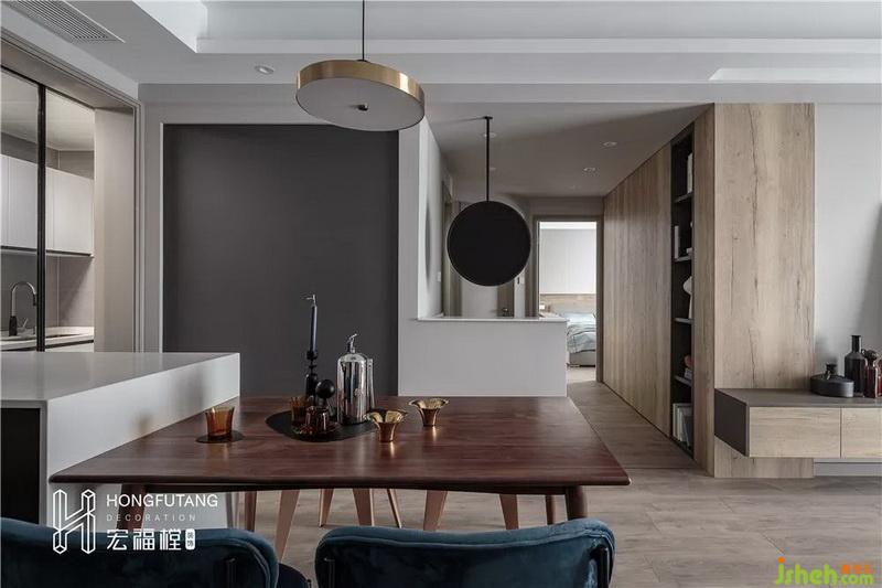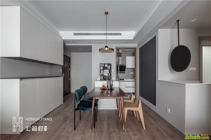 餐廳與客廳在同一空間內(nèi),利用走廊將兩個空間自然分隔;餐廳增加島臺,以餐臺+餐桌的形式體現(xiàn),利用剩余空間增加了可操作區(qū)域,餐廳的關(guān)聯(lián)性更強;餐廳空間有限,為了不影響空間動線,在餐桌椅的選用上,選擇體態(tài)小,矮靠背的餐椅,藍色絲絨質(zhì)地的餐椅,舒適度強,提高空間格調(diào);餐廳位于進門左側(cè),右側(cè)設(shè)立頂天立地柜,可用作鞋柜和公共收納空間使用,選用中鏤空設(shè)計,從視覺上減少滿墻的呆板,鏤空位置也可作為進門放置物品和擺放收納使用;餐廳墻體選用磁性黑板漆,可以選用磁貼、便利貼、留言等形式作為家庭交流互動的區(qū)域,一面黑板,就包含了主人對于生活及情感互動的理解和理想。