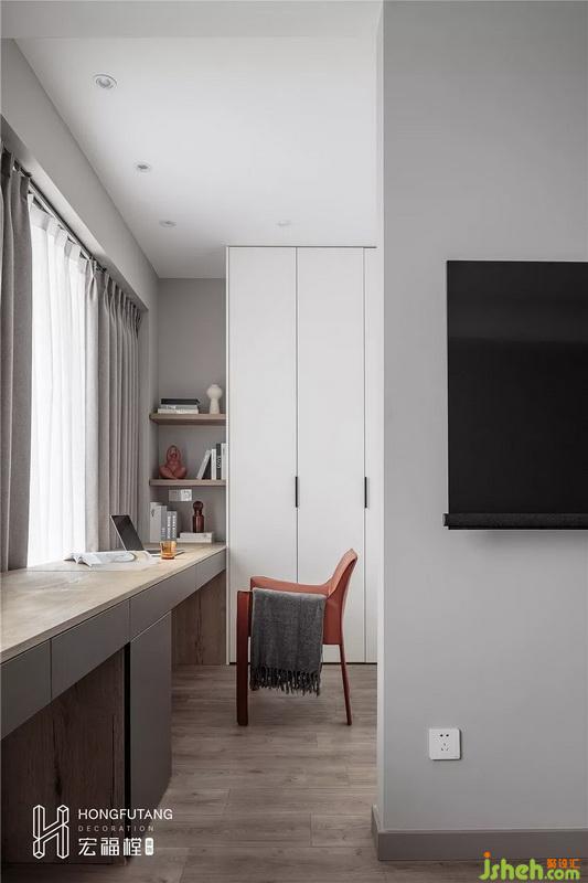 主臥空間容納了可變空間,主臥的功能性更強(qiáng),將衣帽間、書房都融入了整個(gè)主臥,合理的尺度布局保證了空間的功能性和舒適性,擴(kuò)大了主臥的收納空間;臥室沒有多余的裝飾,空間背景墻選用上下分隔的樣式,空間層次感更強(qiáng),根據(jù)日常習(xí)慣設(shè)置比例,保重空間美觀和實(shí)用度;為保證空間材料的統(tǒng)一性,窗臺(tái)面板也選用木質(zhì)材料,提高空間質(zhì)感;書桌靠窗連接窗臺(tái)設(shè)立,在有限的空間內(nèi),將主臥實(shí)用性最大限度使用。
