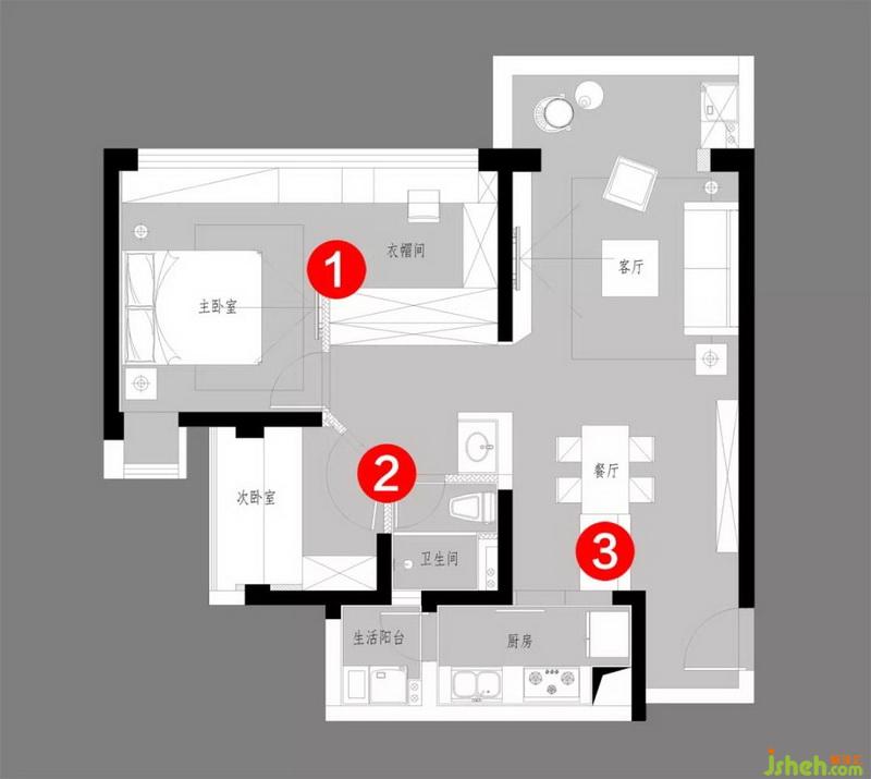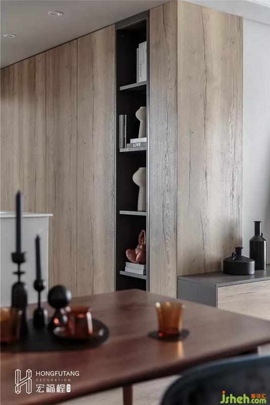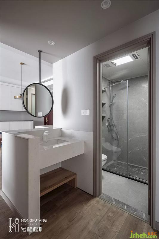 原始戶型中需要通過衛(wèi)生間進(jìn)入次臥,不僅影響使用,也不利于兩個(gè)空間布局,設(shè)計(jì)師將次臥入口獨(dú)立,由走廊空間直接進(jìn)入;衛(wèi)生間選用開放式干濕分離,將干區(qū)空間融入走廊及公共區(qū)域,增加客廳的視覺通透性和走廊的視覺舒適性,也不影響空間使用功能,滿足日常生活需求。