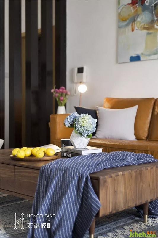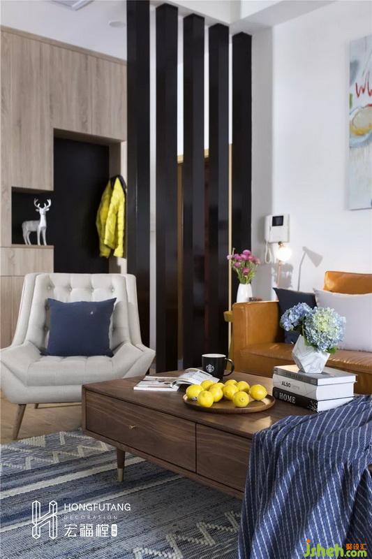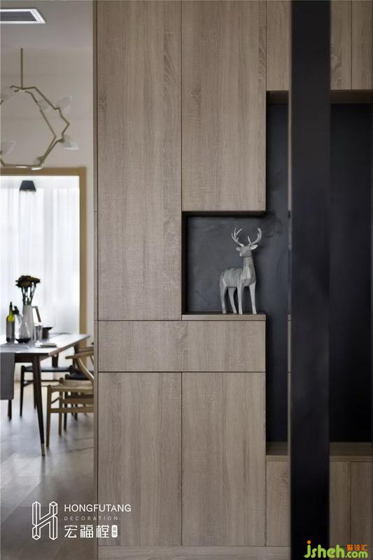 左側靠客廳空間選用木質柵欄作為隔斷,起到分區(qū)作用,避免從客廳一眼望穿,保證空間一定的私密性,也不影響空間通透感,加強了入戶的空間感。
