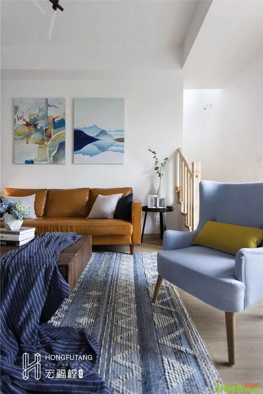 考慮到常駐人口,選用黃櫨色皮質沙發(fā)搭配兩個單人沙發(fā)椅,保證足夠座位數(shù)量的情況下,減少家具對空間的占用,空間感更通透;電視墻相對較長,為保證優(yōu)良的視聽感,在電視尺寸比例的選用上,與電視墻搭配選擇,避免了原本就為白色的電視墻過空;電視柜和茶幾選用同款木色材質,保持空間質感一致,也是對自然空間的一種追尋;藍白紋地毯使得空間更加溫暖有生氣;由于客廳空間緊靠窗邊,選用單獨主燈設計已經能夠保證充足的采光。