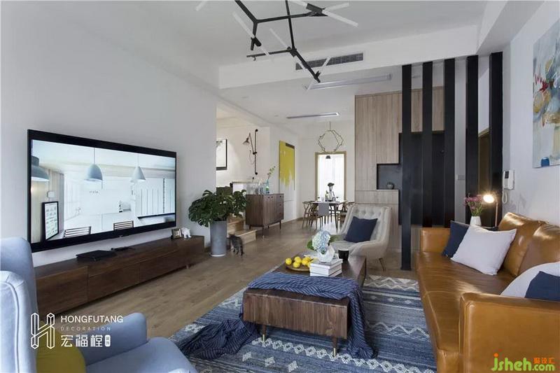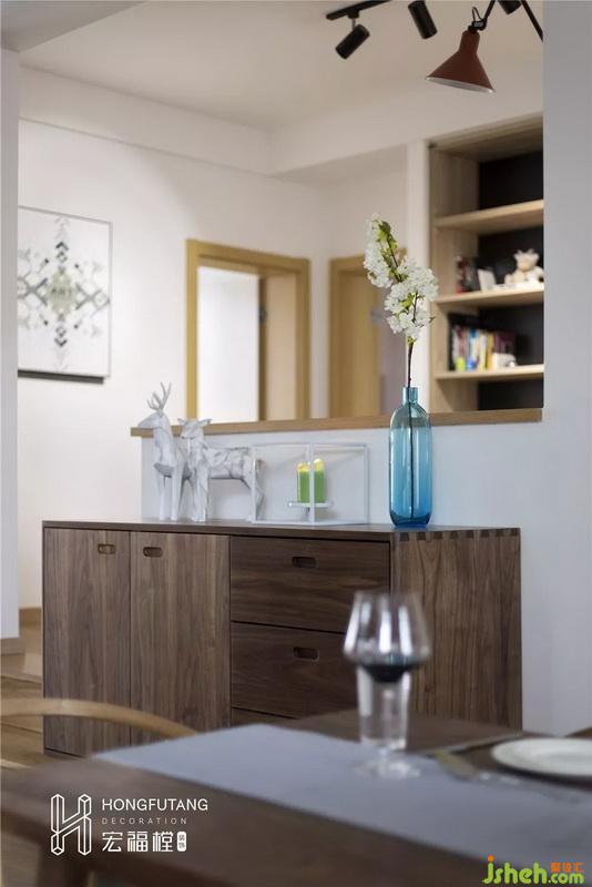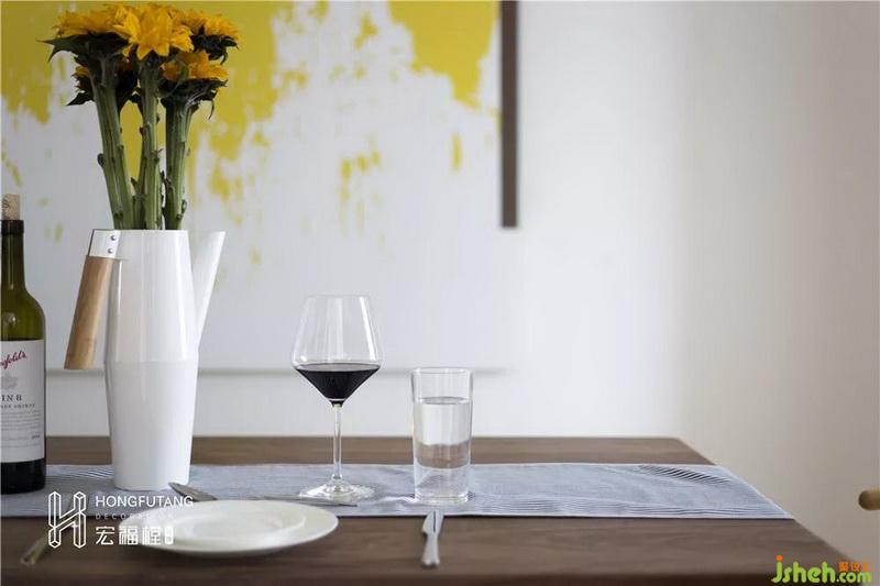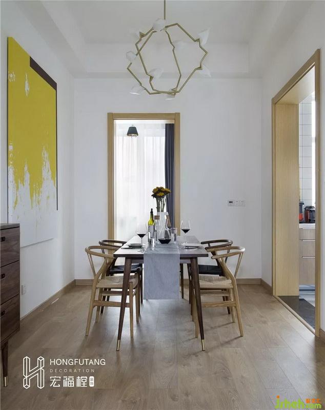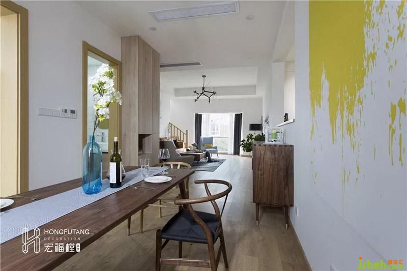 餐廳空間較長,所以在餐桌的選用上,選擇有長方形餐桌可以順餐廳空間擺放;左側靠書房留白區(qū)域設立斗柜,可達到擺放物件和收納使用;整個空間過于空白,在餐廳墻面選用色彩艷麗的明黃色壁畫提高餐廳的明度,活躍餐廳空間。