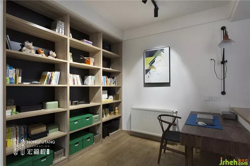書房位于次臥和寵物活動(dòng)區(qū)之間,由臺(tái)階而上,需經(jīng)由書房通向次臥和主臥,所以選用開放式書房,減少墻壁帶來的壓迫感,也空出了走廊空間,進(jìn)門直望視覺感官更加通透;用擺放整齊收納規(guī)范的書柜直接作為墻面裝飾使用,更有生活氣息,也減少了過于繁雜的擺件;書房空間開闊,選用軌道燈搭配壁式臺(tái)燈就能滿足日常工作學(xué)習(xí)需求。