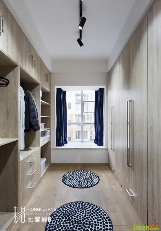 衣帽間的收納柜順應(yīng)空間方向相對(duì)而立,保證了衣帽間原本的采光;兩側(cè)靠墻設(shè)立收納柜,最大限度容納物品,左側(cè)收納以懸掛和開放收納為主,主要擺放一些常用衣物和物件,右側(cè)以封閉收納為主,可容納不常用大件物品,選用藍(lán)色窗簾和地毯與主臥空間色彩保持一致。