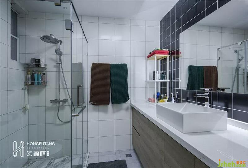主衛(wèi)調(diào)整了布局,滿足了業(yè)主對(duì)大浴室柜的需求,利用更為合理;黑白網(wǎng)紅格子磚搭配,線條感更強(qiáng);右側(cè)靠墻整面設(shè)立收納柜,增添了浴室收納空間,空間顯得更加整潔。
