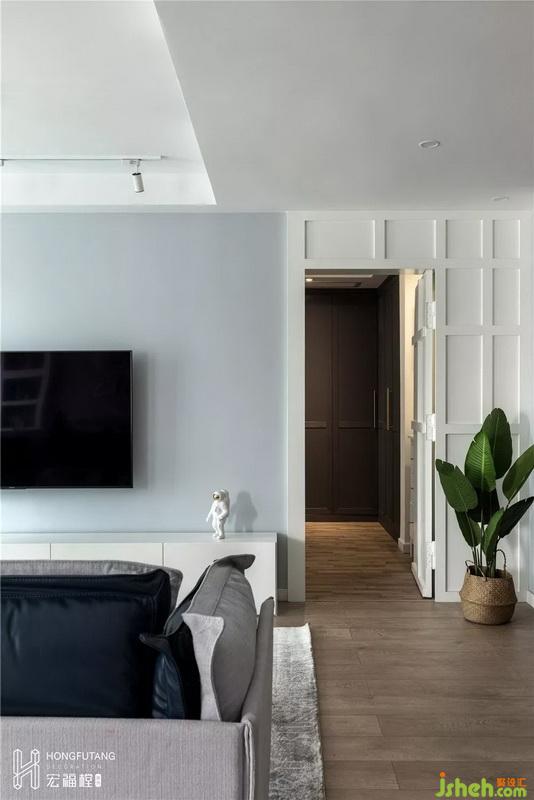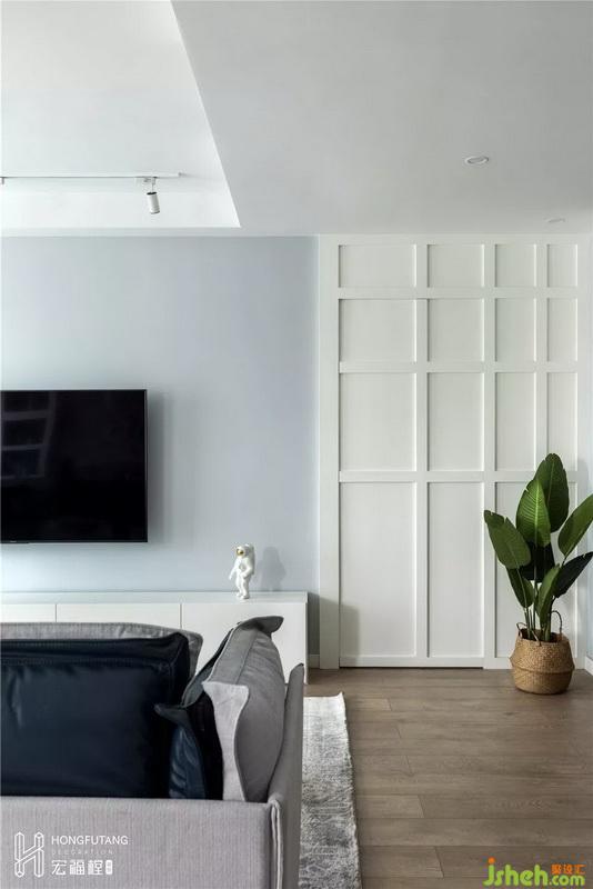 考慮到常駐人口,所以在沙發(fā)的選用上,長款的三人沙發(fā)可以滿足日常需要;由于電視墻左側(cè)為老人房的門洞位置,為了美觀和整個空間風格統(tǒng)一,電視墻左側(cè)墻面和門洞都做成凹出線條設計,將老人房的門洞隱藏其中,隱形門利用突出的漸變的線條弱化的門和墻之間的縫隙,同時使客廳空間更有節(jié)奏感而不呆板;電視墻選用月白色,與左側(cè)白色線條形成差別的同時,也不會因為兩個顏色差異太大形成視覺沖突。