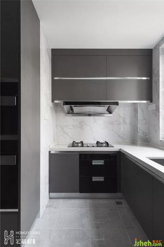 廚房墻體打拆外移240mm,擴大廚房及增加了鞋柜位置;廚房擴大的空間剛好可容納冰箱的擺放;櫥柜選用L型靠墻體設立,最大限度的利用廚房空間;極致的灰白色搭配,風格簡單,提高空間質感,便于清潔衛(wèi)生,廚房空間更顯整潔。