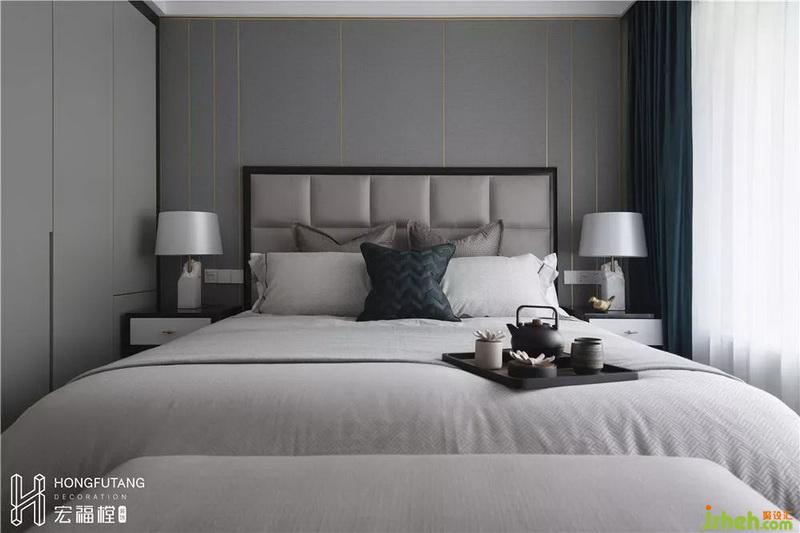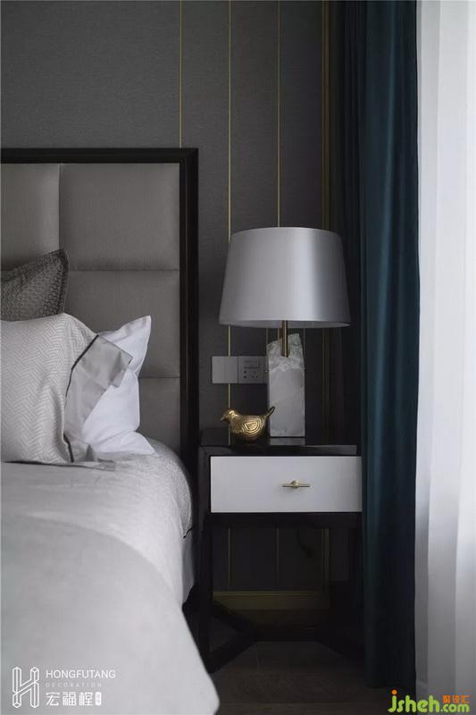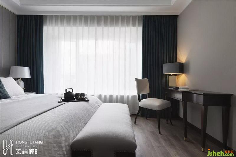 床尾放置橫凳,可以用于日常就坐、擱置日常衣物;窗邊設立書桌,可用作不正式辦公和閱讀區(qū)域。