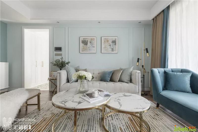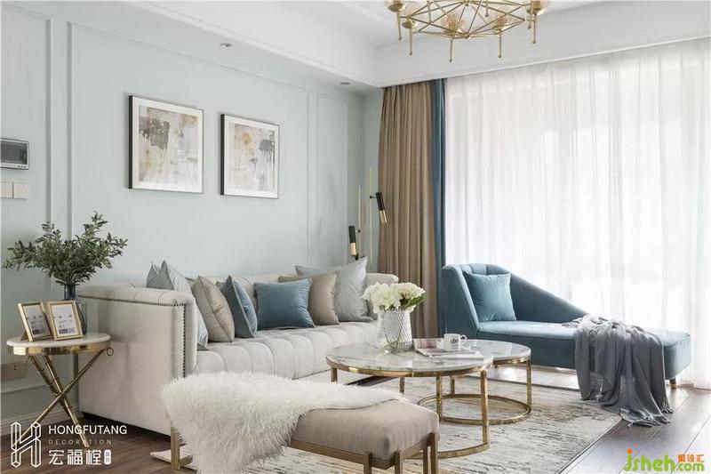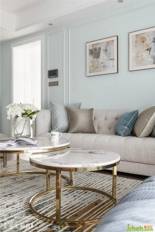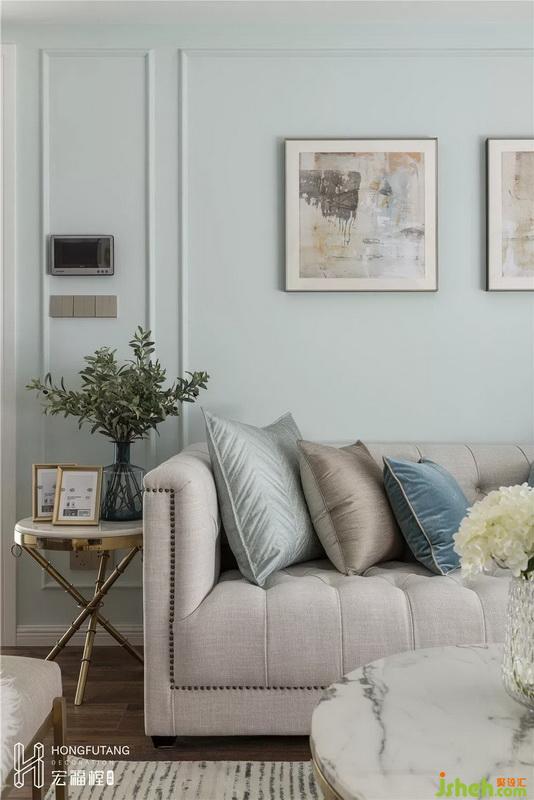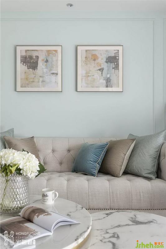 整個空間以清爽明朗為主,選用淺松石色作為墻面,海港藍(lán)運(yùn)用在沙發(fā)和窗簾上,同色系冷調(diào)搭配,空間更加平和,也符合業(yè)主的需求;沙發(fā)、地毯選用淺色系,茶幾為大理石材質(zhì),提高空間時尚度;由于整個空間顏色都顯得較“輕”,所以電視柜為深棕色,突顯空間質(zhì)感,輕重劃分和諧。