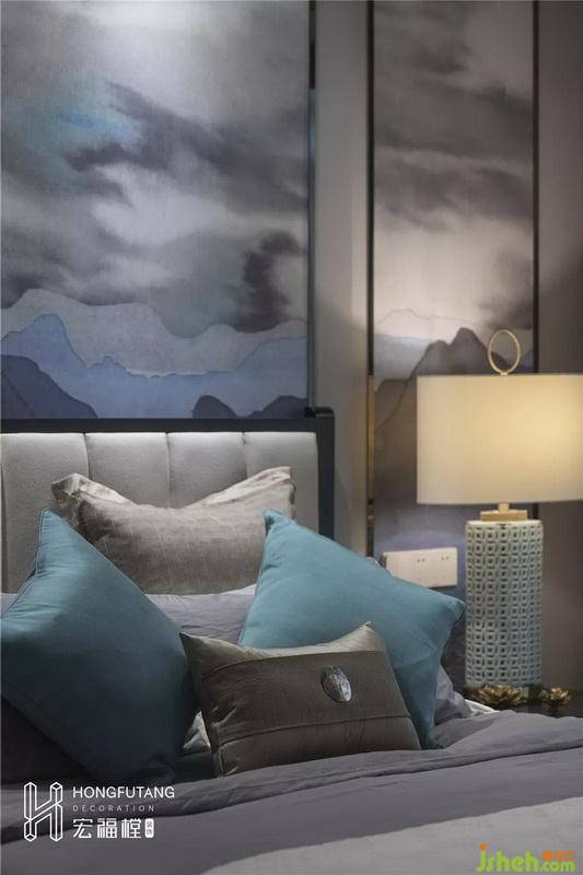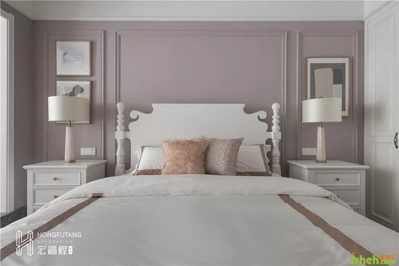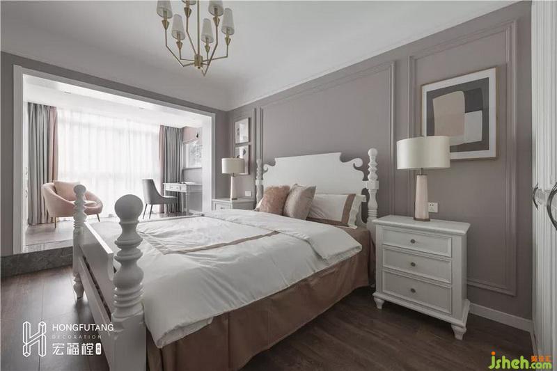 為滿足女兒的少女心,所以女兒房的色調(diào)偏粉嫩系,在選用粉色時,考慮到明度太高的粉色隨著女兒的成長會顯得過于幼稚,綜合整個空間風(fēng)格,選用灰粉色,降低了空間色彩明度,中和了整個空間色調(diào)和少女心事;家具和軟裝搭配上選用公主床,少女氛圍濃烈。