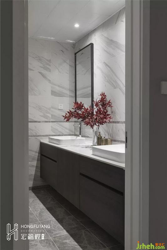 一層衛(wèi)生間為公共衛(wèi)生間,整個空間衛(wèi)生間都采用大理石紋墻磚搭配青灰色地磚,色調(diào)簡潔大方都以灰色為主,朱砂紅、金屬色作為空間裝飾,精致沉穩(wěn)。