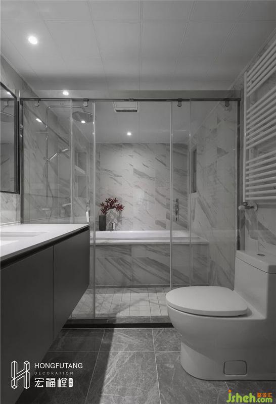 主衛(wèi)設(shè)計公司延續(xù)一層衛(wèi)生間風(fēng)格,浴缸采用嵌入式,加之玻璃門隔斷,將空間干濕分離,便于清潔衛(wèi)生的同時,也最大限度利用了空間。