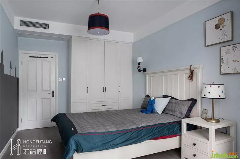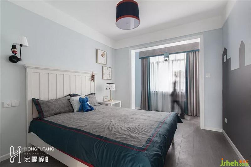 兒童房選用淡藍色為主色,灰藍色窗簾與白色邊框交錯,增添空間層次;城堡墻紙符合小朋友的童心,將兒童房陽臺作為小朋友學習區(qū)和玩具收納區(qū)角,與休息區(qū)互相獨立,保證兩個區(qū)域的整潔和空間合理利用。