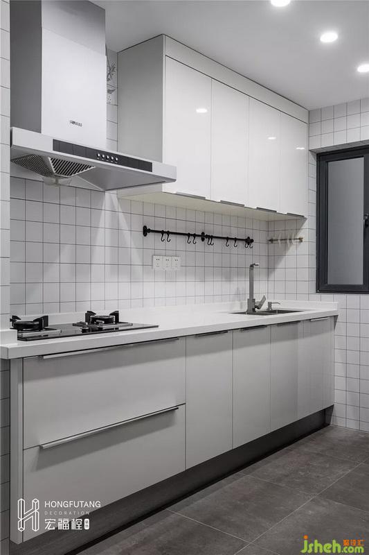 廚房內(nèi)選用網(wǎng)紅格子磚,簡單素雅,線條紋路使得廚房空間更加整潔。