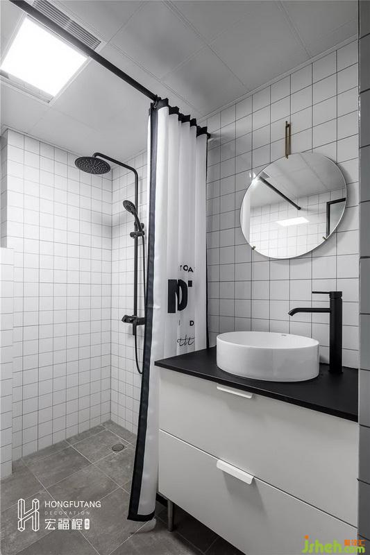 衛(wèi)生間延續(xù)廚房風格,黑白灰三色組合,空間干凈整潔;采用浴簾將衛(wèi)生間干濕分離,不影響使用同時,也減少隔斷對衛(wèi)生間空間占用。