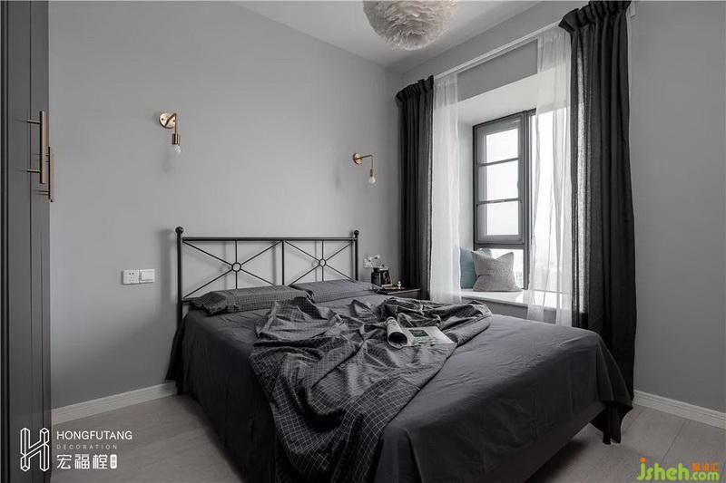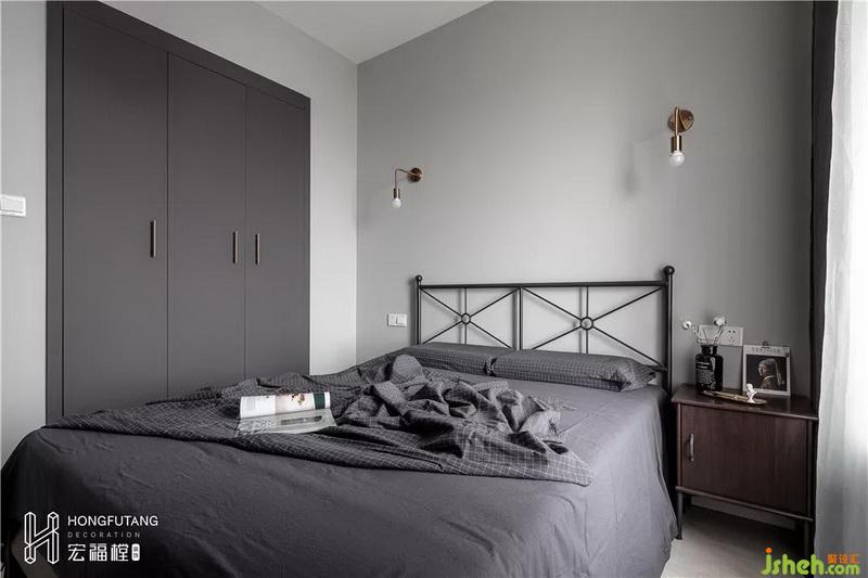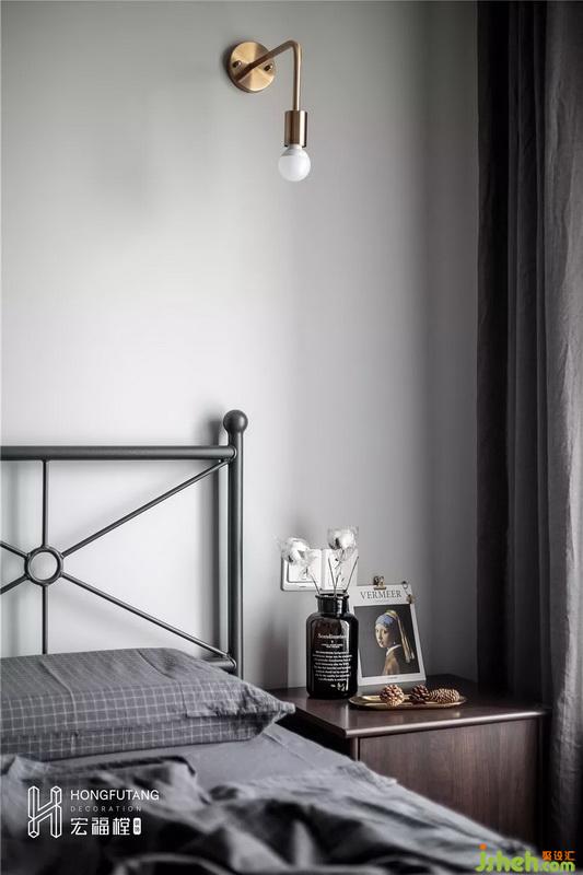 在家具選用上,選用灰黑色保證空間統(tǒng)一風格,鐵質(zhì)床占用面積小,風格清新簡潔,選用主燈搭配床頭燈,床頭燈設計可以補充光源,增添氛圍燈光,也便于睡前開關。