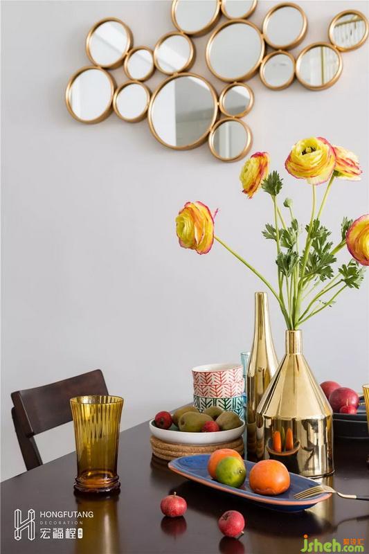 干區(qū)空間面積壓縮,所以在設(shè)計(jì)時(shí)以簡潔為主,不需要設(shè)立太多裝飾,帶有柜子的洗手臺(tái)就能解決大部分收納問題,也使得干區(qū)空間整潔有條理;選用六邊形鏡子,使得小空間更加靈動(dòng)不壓抑。