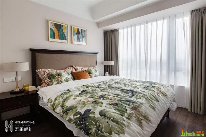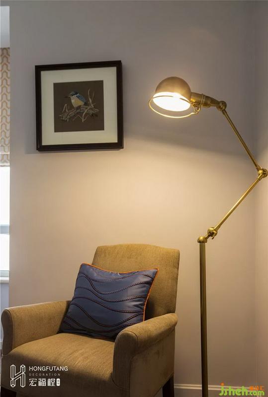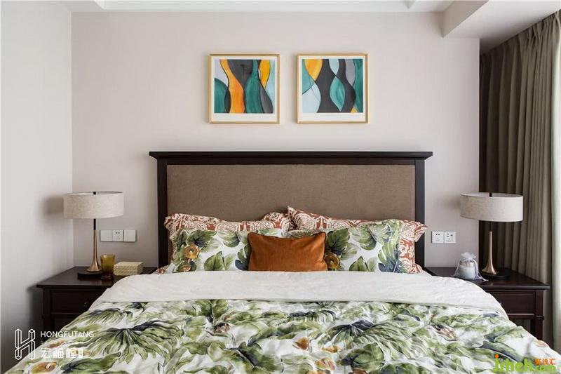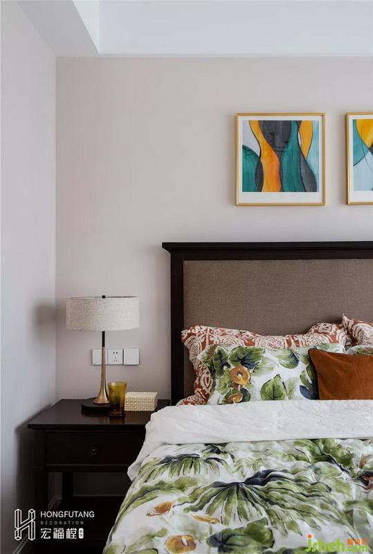 主臥選用典型美式搭配色彩米金咖作為主色,用綠色和橘色增添空間活力。這是源于臥室空間寧靜的環(huán)境氛圍,選用低明度色彩更利于臥室空間打造,用小范圍的亮色提亮部分空間明度,也不會(huì)顯得過于沉悶。