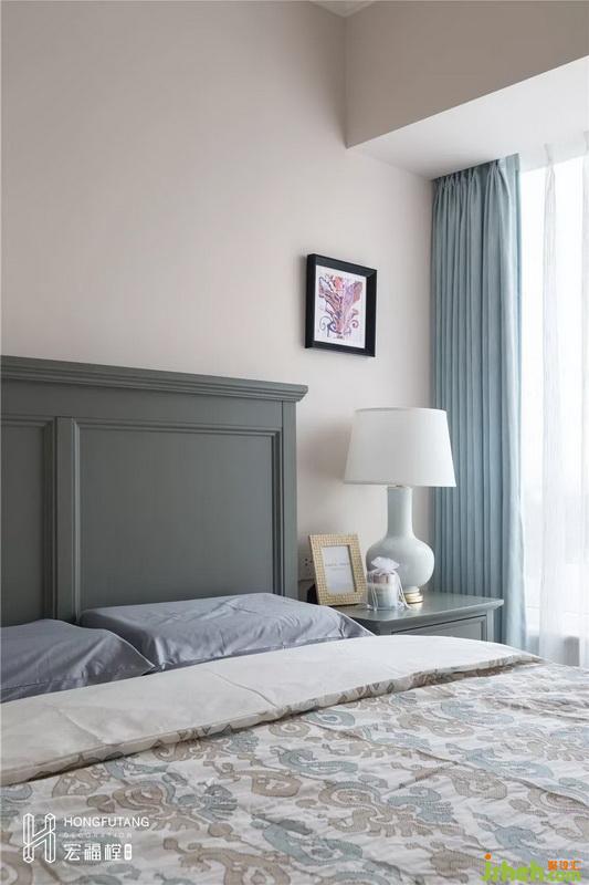 次臥選用灰藍(lán)色作為主色調(diào),空間寧靜清新。