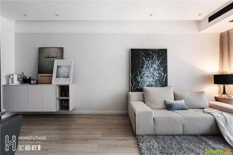 業(yè)主想有一個戶外活動空間,休閑陽臺依然保留??蛷d空間有限,所以沒有采用茶幾,用地毯和沙發(fā)延伸客廳空間,地毯的使用使得冰冷的地板有了溫暖,可容納業(yè)主二人平時看電視,打游戲,在朋友來時,也可直接席地而坐,減少多余凳子對空間占用;電視墻選用白色墻壁搭配木色底板,本身整個客廳選用白色墻壁,顏色單薄,搭配木色包邊做成凹凸?fàn)?,使得空間層次感更強;選用底臺設(shè)計,減少電視柜對空間的占用,視覺上空間更加干凈;沙發(fā)墻選用大篇幅的深藍(lán)色系畫作,統(tǒng)一空間色系,也避免了墻面的空白感.