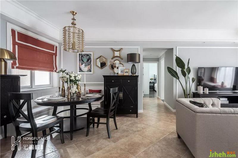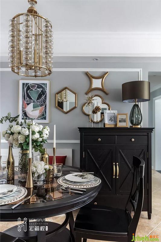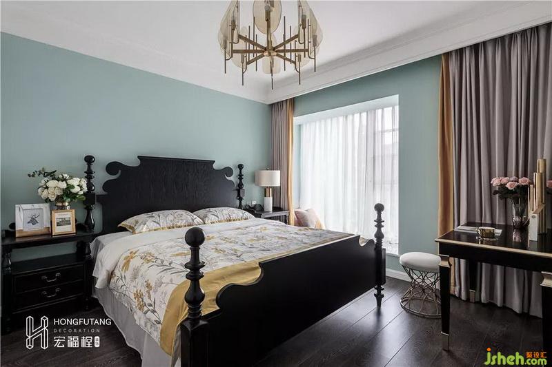 主臥風(fēng)格與書房風(fēng)格一致,延續(xù)書房的色彩印象,在軟裝上選用金屬色裝飾,細(xì)節(jié)處精致考究,打造空間溫情的氛圍。為符合業(yè)主本身氣質(zhì),沒(méi)有選用過(guò)于明亮的顏色,而是在窗簾、擺件等細(xì)微處用暖色系來(lái)營(yíng)造空間氛圍。