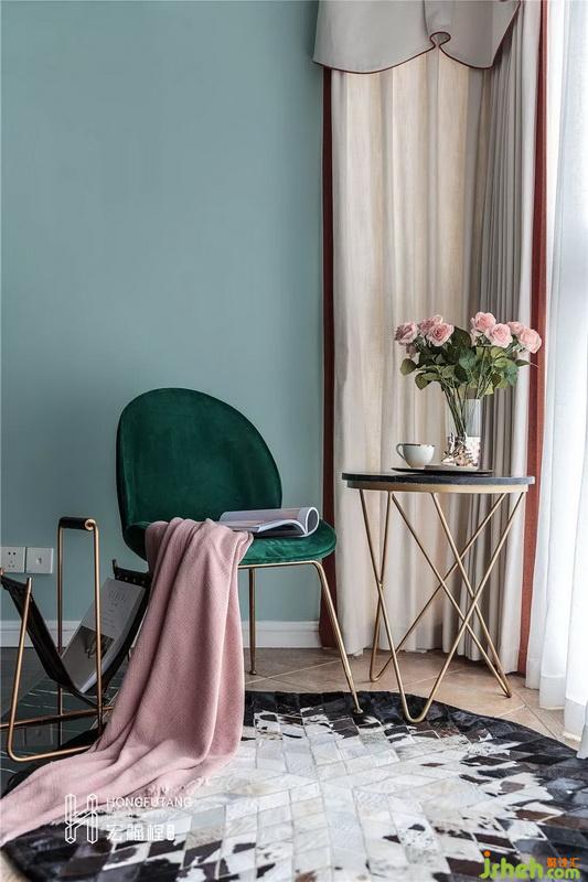 原始戶型中書房一角為空調(diào)外機(jī)放置陽(yáng)臺(tái),考慮到這樣的設(shè)計(jì)會(huì)使得書房空間出現(xiàn)缺角,空間不方正,無(wú)法最大利用空間,所以將外置陽(yáng)臺(tái)融入書房之中,將此處作為業(yè)主休閑閱讀角落,選用墨綠色座椅搭配淺色空間,空間環(huán)境清靜不失靈動(dòng)。