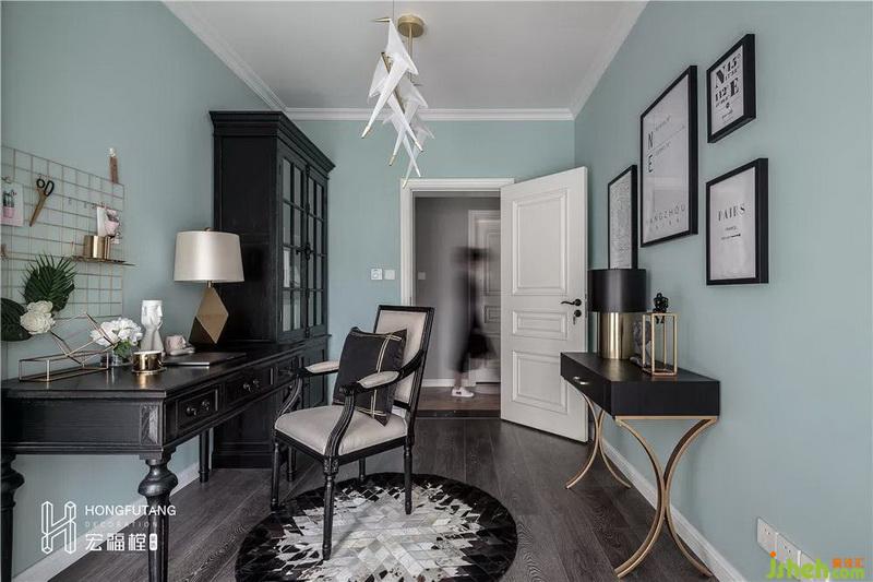 書房選用薄荷綠,這樣的顏色采用使得感官更舒服、清亮,選用黑色做舊實(shí)木桌柜,讓整個(gè)空間沉靜下來(lái),空間重點(diǎn)更突出;將書房原始的推拉門做成平開(kāi)門形式,在原來(lái)推拉門左側(cè)騰出書柜位置,用來(lái)收納業(yè)主的書籍;書桌墻壁前放置金屬壁掛,可以放置一些便利貼、剪刀等辦公用具,節(jié)約書桌空間同時(shí),也能豐富墻面。