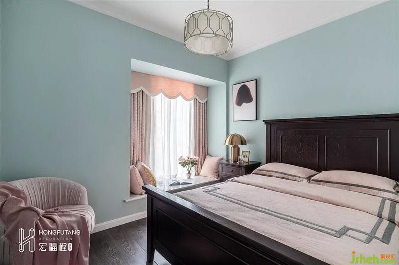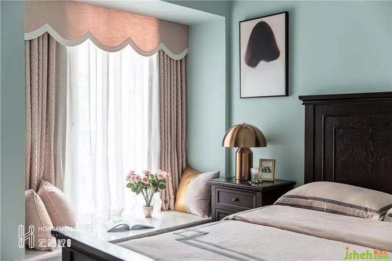 次臥選用主臥同款風(fēng)格,唯一不同是,次臥大多時(shí)候用作父母或接待親友,在顏色的運(yùn)用上,選用粉色更加柔和,比起主臥的溫文爾雅,次臥更加?jì)轨o平和。
