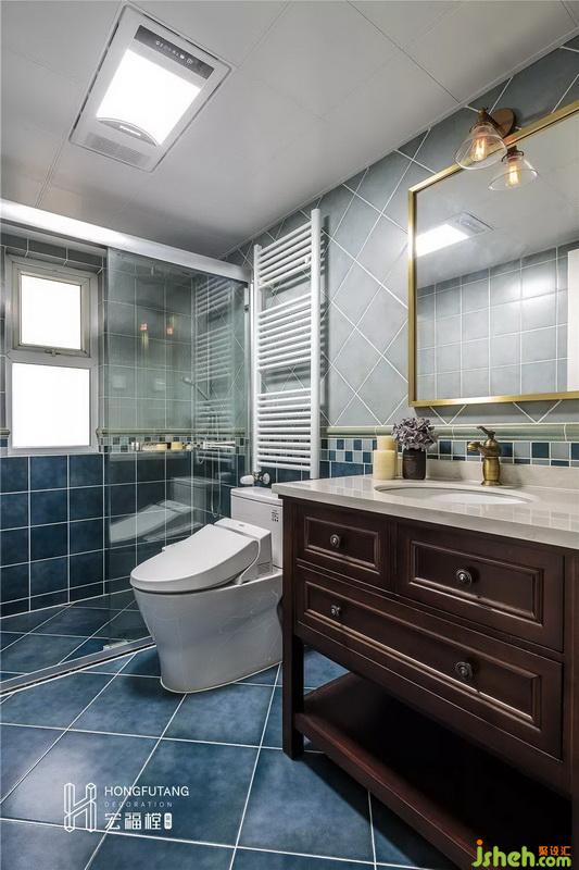 衛(wèi)生間設(shè)立淋浴間,干濕分離,便于清潔的同時(shí),減少空間熱量流失;選用深淺不同的藍(lán)色瓷磚打造漸變的空間,使得空間墻面更豐富;洗手臺(tái)上面做成收納抽屜,能夠把有限的空間,充沛的使用起來(lái),有更多收納的空間,也能夠確保洗手臺(tái)面堅(jiān)持整齊,下面做成置物架,可以藏匿不常用大件浴室用具。