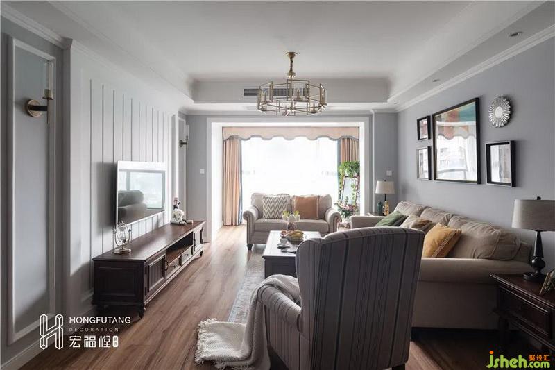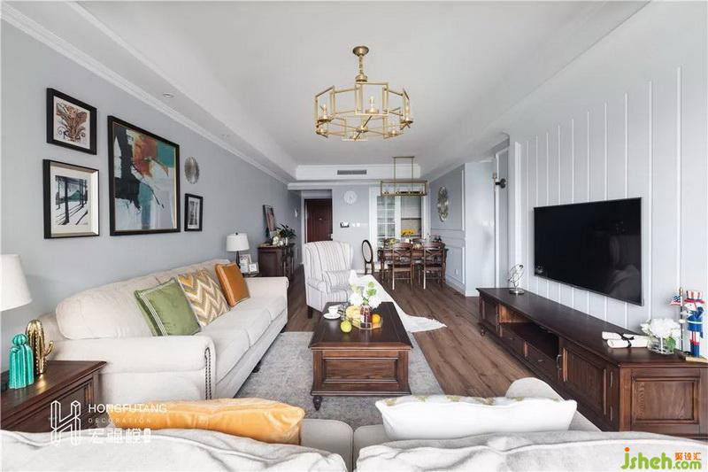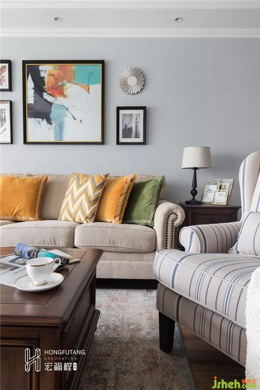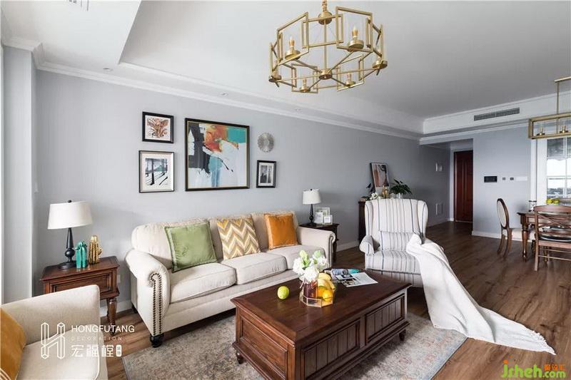 美式客廳風格簡潔明快,色彩明艷亮麗,所以在色彩搭配上,家具選用沉穩(wěn)的棕色搭配白色,用黃綠粉等軟裝來調(diào)節(jié)空間的明亮度。