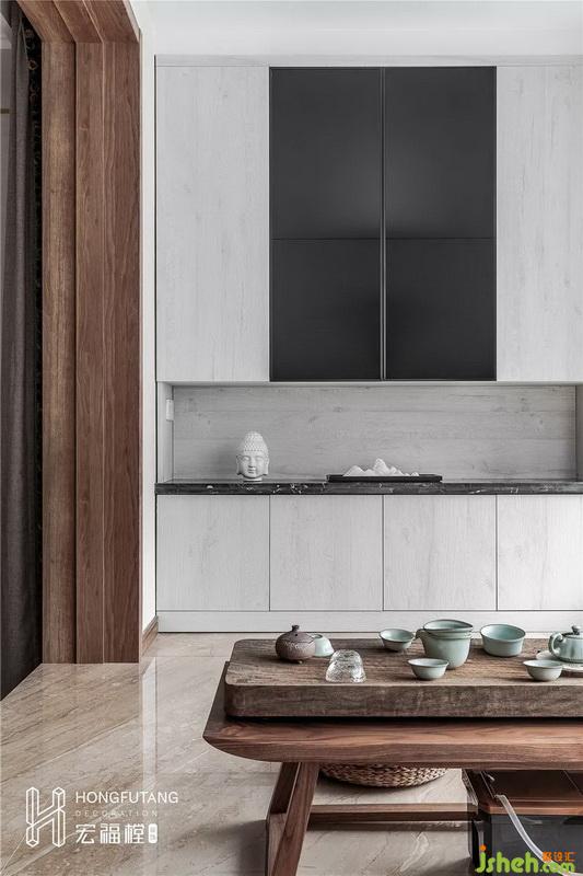 客廳連接陽臺(tái),將陽臺(tái)做成茶室,可以作為休閑放松和接待客人之處;陽臺(tái)左側(cè)靠墻設(shè)立成中鏤空形式的頂天立地柜,上下作為封閉收納空間使用,方便收納茶具與男主人的工具箱。中間作為物品展示、擺放裝飾品,增加空間氛圍和趣味性。不論冬夏,或清晨,或午后,當(dāng)室外的光線透過百葉窗柔和飄灑進(jìn)來,一家人都可以圍坐在這里品茗賞杏,促膝談心,忘掉學(xué)校的煩惱,忘掉工作的煩惱,在這里只有家人和知己。